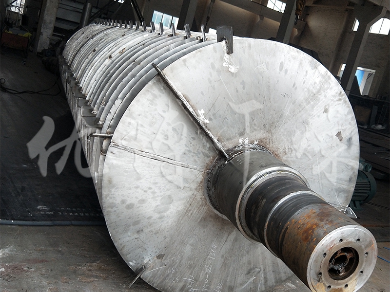 污泥由给料机经溜槽进入烘干机内导料板上,随着筒体的转动,污泥被导至倾斜扬料板上即被提升到筒体的中心位置,逐渐洒落形成料幕,高温气流从中穿过,使污泥预热并蒸发部分水分。当污泥洒落、移动到活动的篦条式翼板上时,物料又与预热过的篦条式翼板夹杂在一起,将热量传给物料,使部分水分蒸发。同时,翼板夹带物料提起、洒落,重复多次,物料与热气流进行对流和接触热交换。同时埋在物料中的清扫装置,也沿圆弧形扬料板的里侧下滑,把扬料板内壁粘附的物料清扫下来。当清扫装置随筒体转过垂直线以后,又在圆弧扬料板背面拖动,将其粘附在扬料板外壁的物料清扫下来。随着筒体的不断转动,使部分水分蒸发,污泥得到进一步干燥。同时,清扫装置对污泥团球也起到了打碎作用,提高了干燥速度,^后污泥干燥后变成低水分的松散物料,由出料口排出。