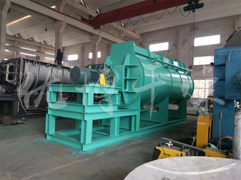 空心轴上密集排列着楔型中空浆叶,热介质经空心轴流经浆叶。单位有效容积内传热面积很大,热介质温度从-40℃到320℃,可以是水蒸汽,也可以是液体型:如热水、导热油等。间接传导加热,没有携带空气带走热量,热量均用来加热物料。热量损失仅为通过器体保温层向环境的散热。楔型浆叶传热面具有自清洁功能。物料颗粒与楔型面的相对运动产生洗刷作用,能够洗刷掉楔型面上附着物料,使运转中一直保持着清洁的传热面。浆叶干燥机的壳体为Ω型,壳体内一般安排二到四根空心搅拌轴。壳体有密封端盖与上盖,防止物料粉尘外泄而充分发挥作用。